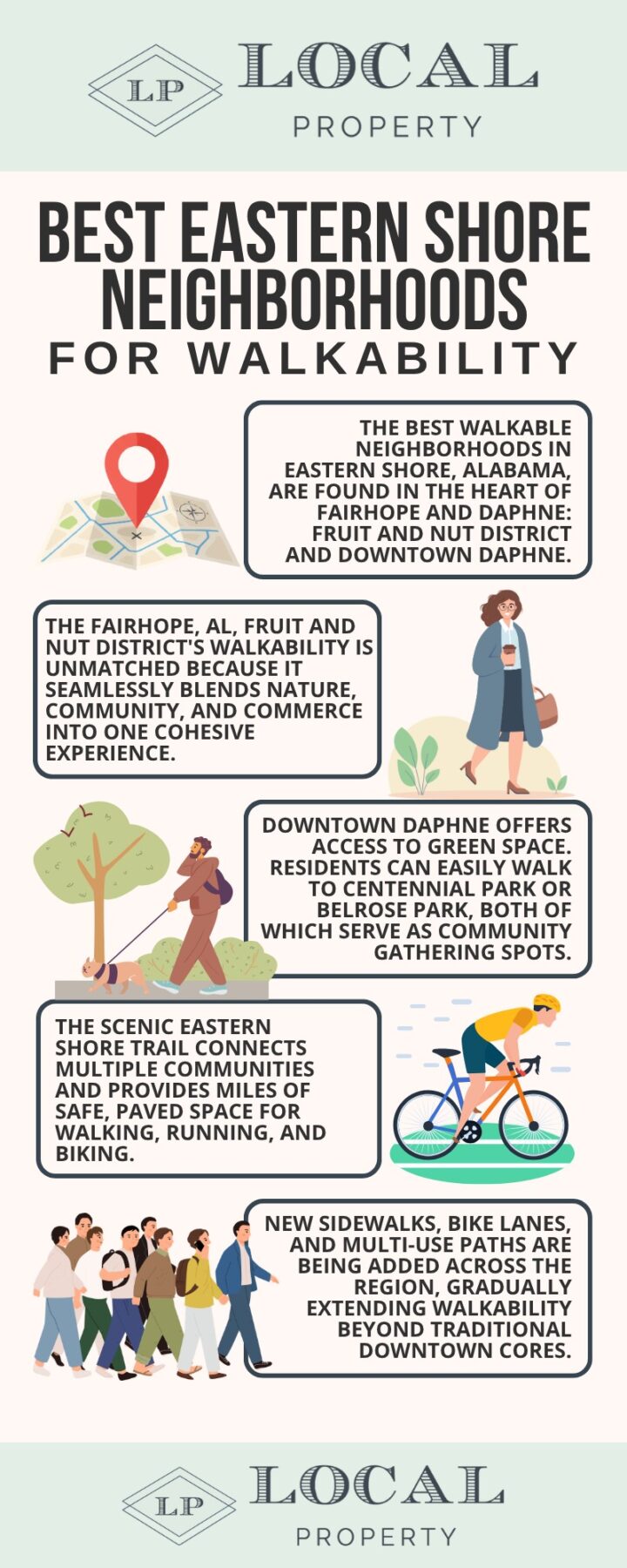 While Fairhope and Daphne lead the way, the idea of pedestrian-friendly towns in Eastern Shore, AL, is expanding. Local municipalities are recognizing the demand and responding with infrastructure improvements.